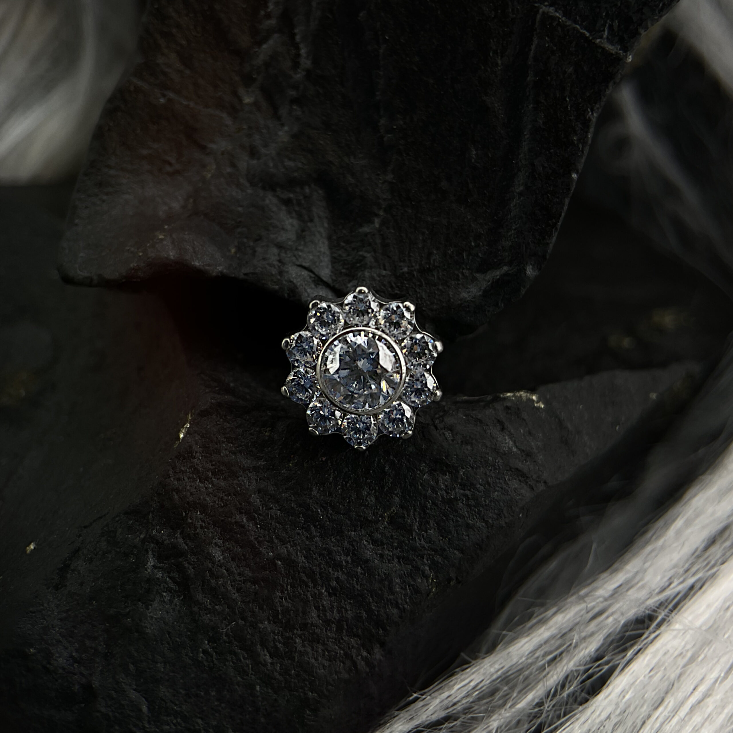 Crystal Flower to elegancka biżuteria w formie kwiatka, wykonana z centralnego, dużego kryształowego kamienia otoczonego mniejszymi, lśniącymi kryształkami. Subtelne detale przypominają płatki kwiatu, nadając całości wyrafinowanego charakteru. Idealna do różnego rodzaju piercingów w uchu, takich jak helix, conch czy flat.