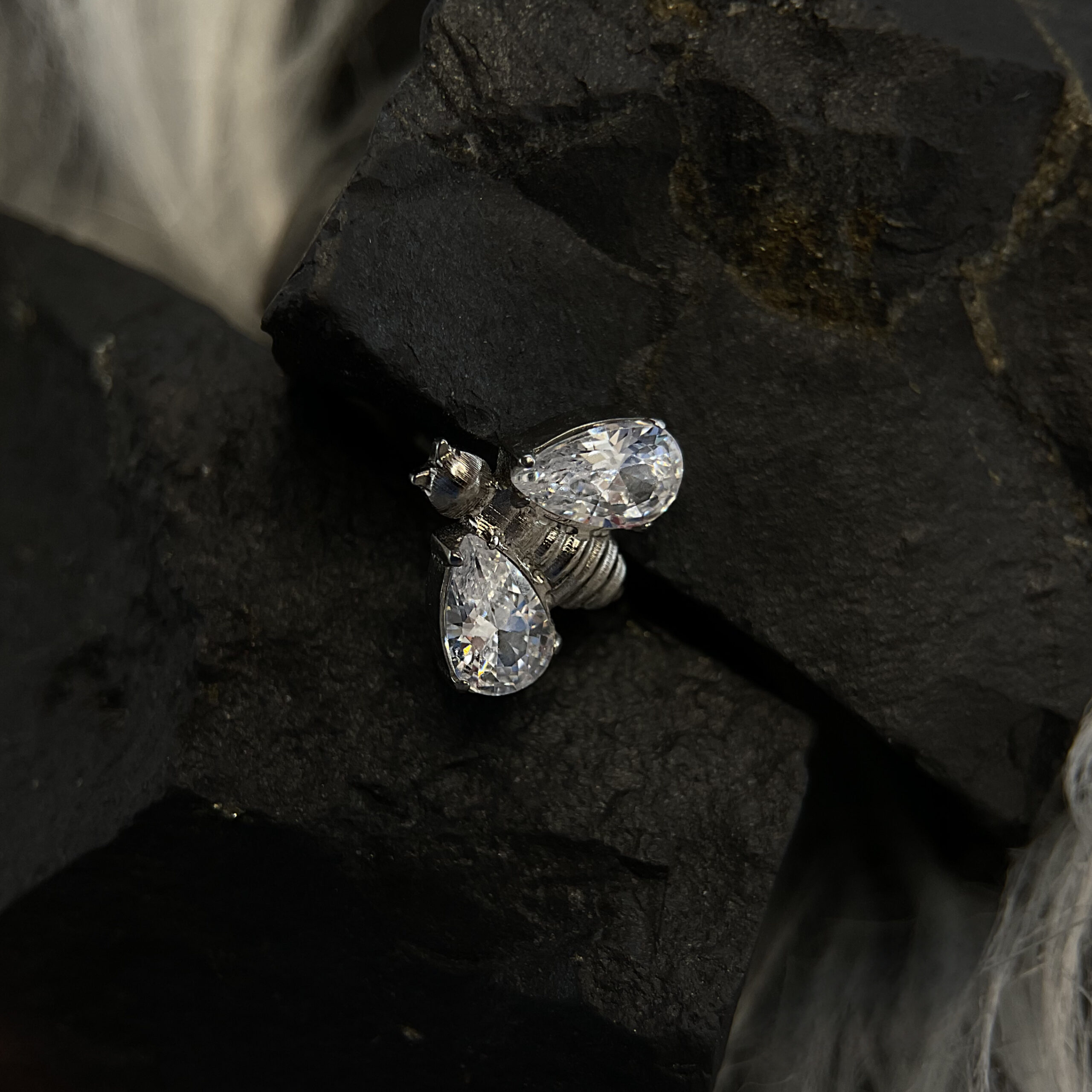 Diamond Bee to uroczy kolczyk w kształcie pszczoły, wykonany z wysokiej jakości tytanu. Skrzydełka pszczoły zdobią lśniące kryształy o kroju łezki, które dodają delikatności i blasku. Detale odwłoku i głowy zostały precyzyjnie wykonane, tworząc realistyczny i elegancki wygląd.