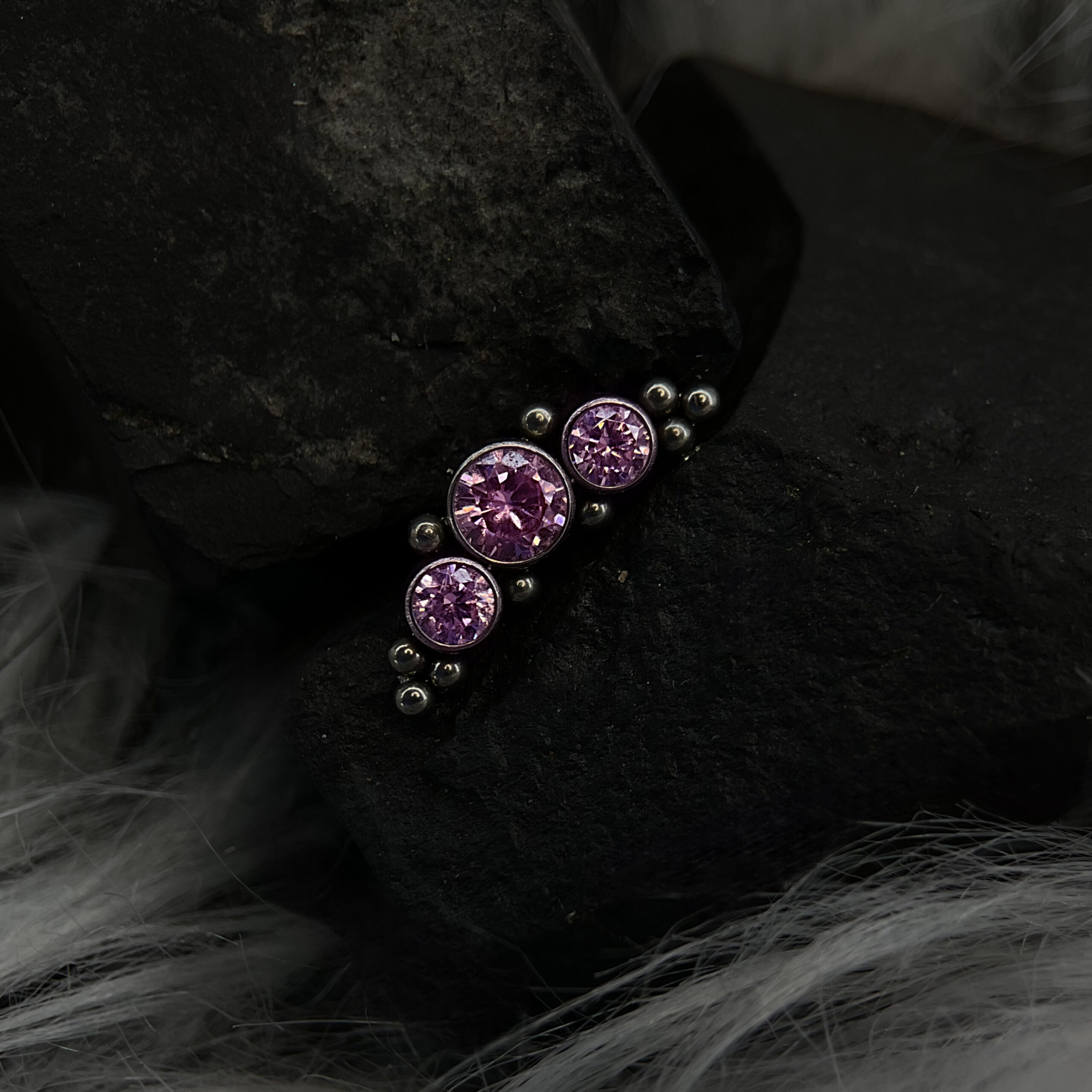 Kolczyk z trzema różowymi cyrkoniami w minimalistycznym układzie, otoczonym subtelnymi tytanowymi kuleczkami. Centralny, większy kamień podkreśla wyjątkowość, a symetryczne mniejsze cyrkonie dodają harmonii i elegancji. Biżuteria wykonana z najwyższej jakości tytanu, zapewnia trwałość i komfort noszenia. Idealny wybór dla osób ceniących delikatne, a zarazem efektowne akcenty.