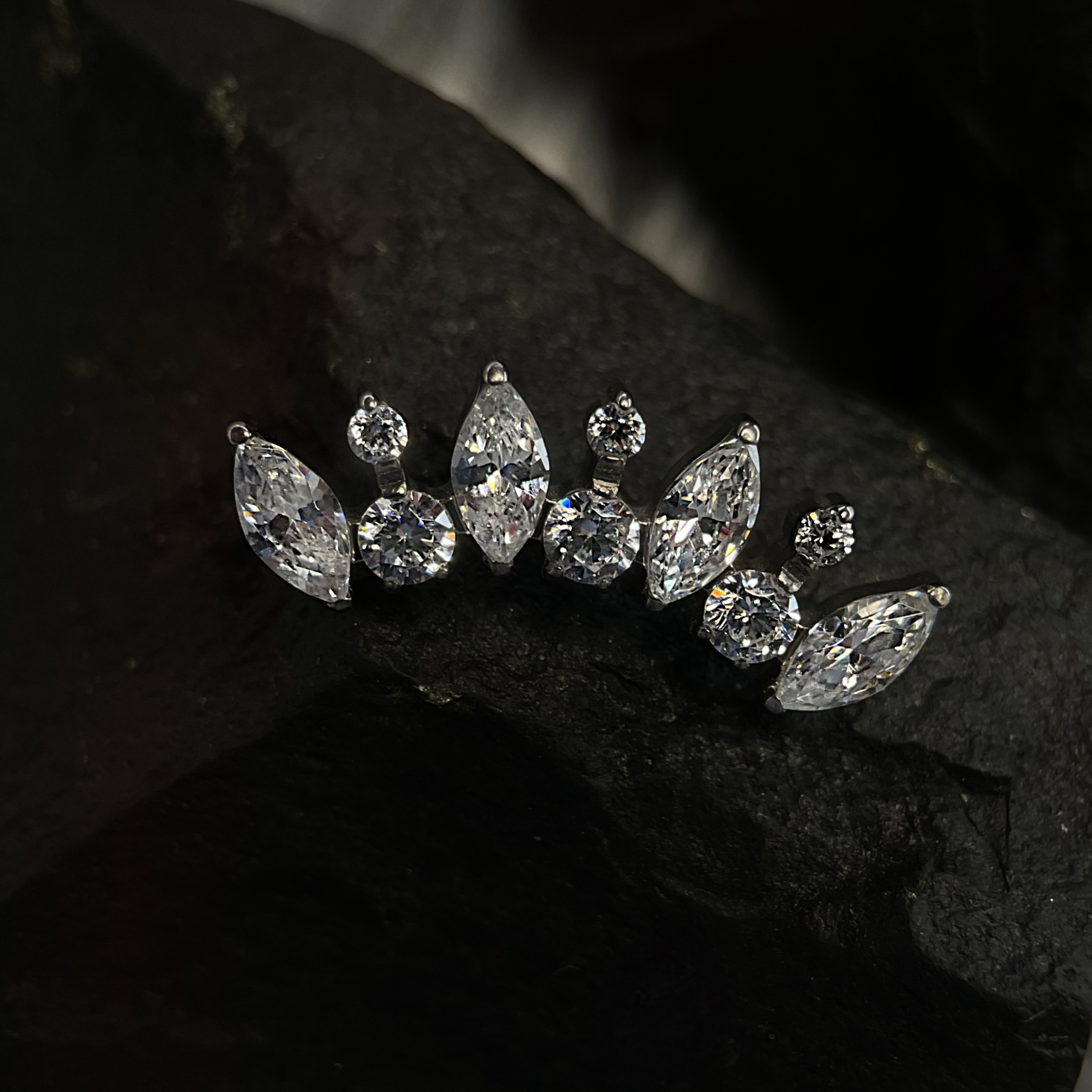 Ekskluzywny kolczyk o asymetrycznym designie z kaskadą przezroczystych, lśniących kamieni, które nadają biżuterii elegancji i klasy. Ułożenie kamieni w delikatnym łuku dodaje wyrafinowania każdej stylizacji.
